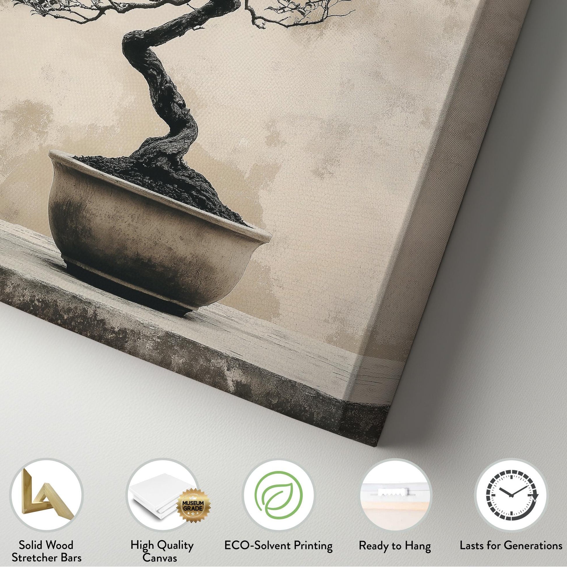 Bonsai Grey Vertical Wall Art Japanese, Decor Botanical Canvas Print, Muted Colors Sephia Big Canvas Art