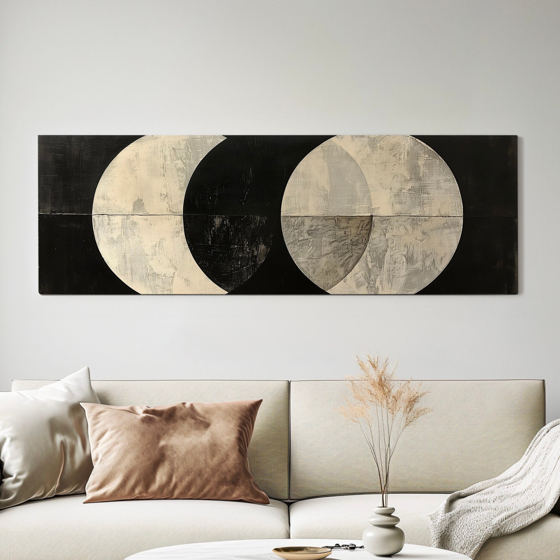 Geometric Planets Long Horizontal Wall Art For Living Room, Panoramic Mid Century Modern Canvas Print, Moon Decor Canvas Art