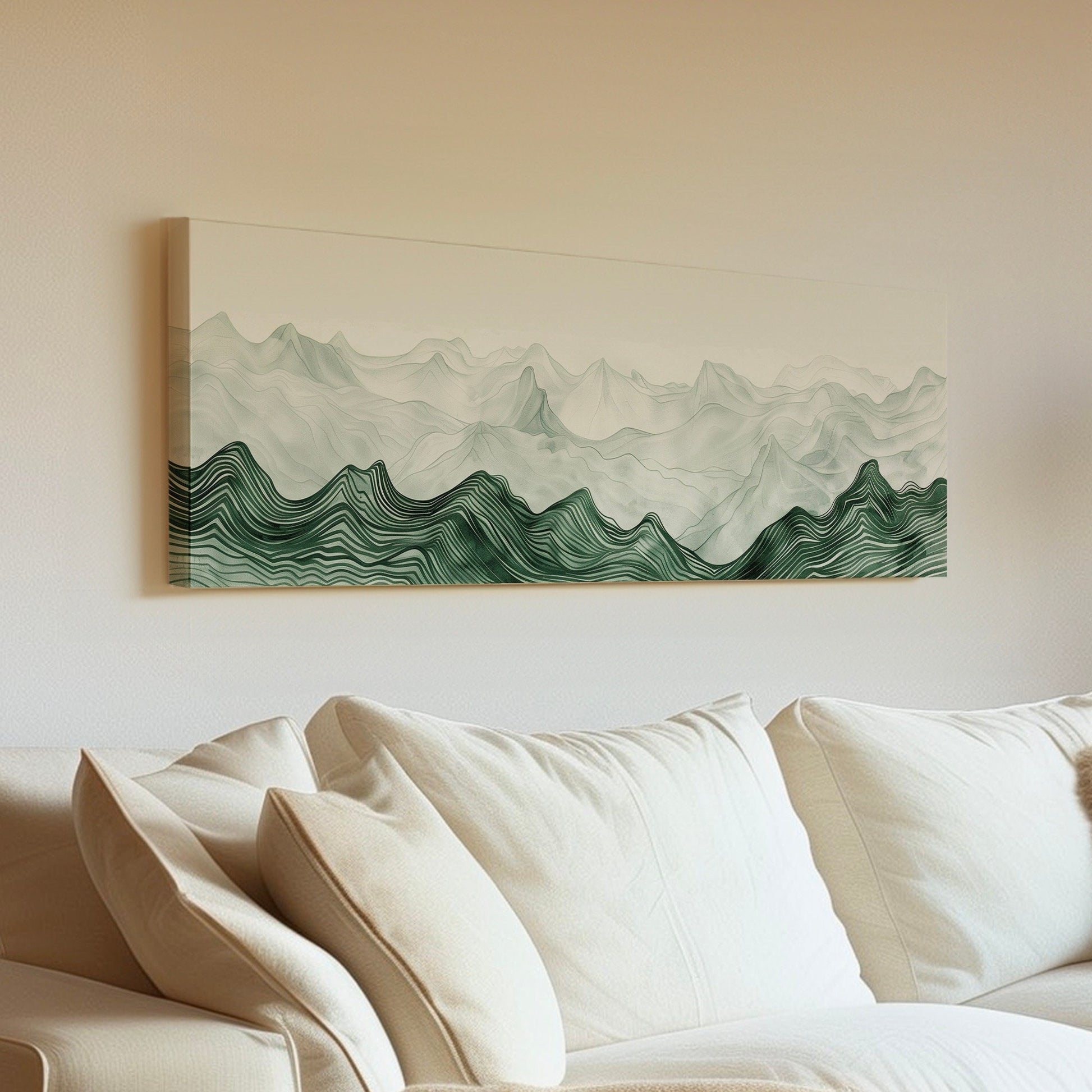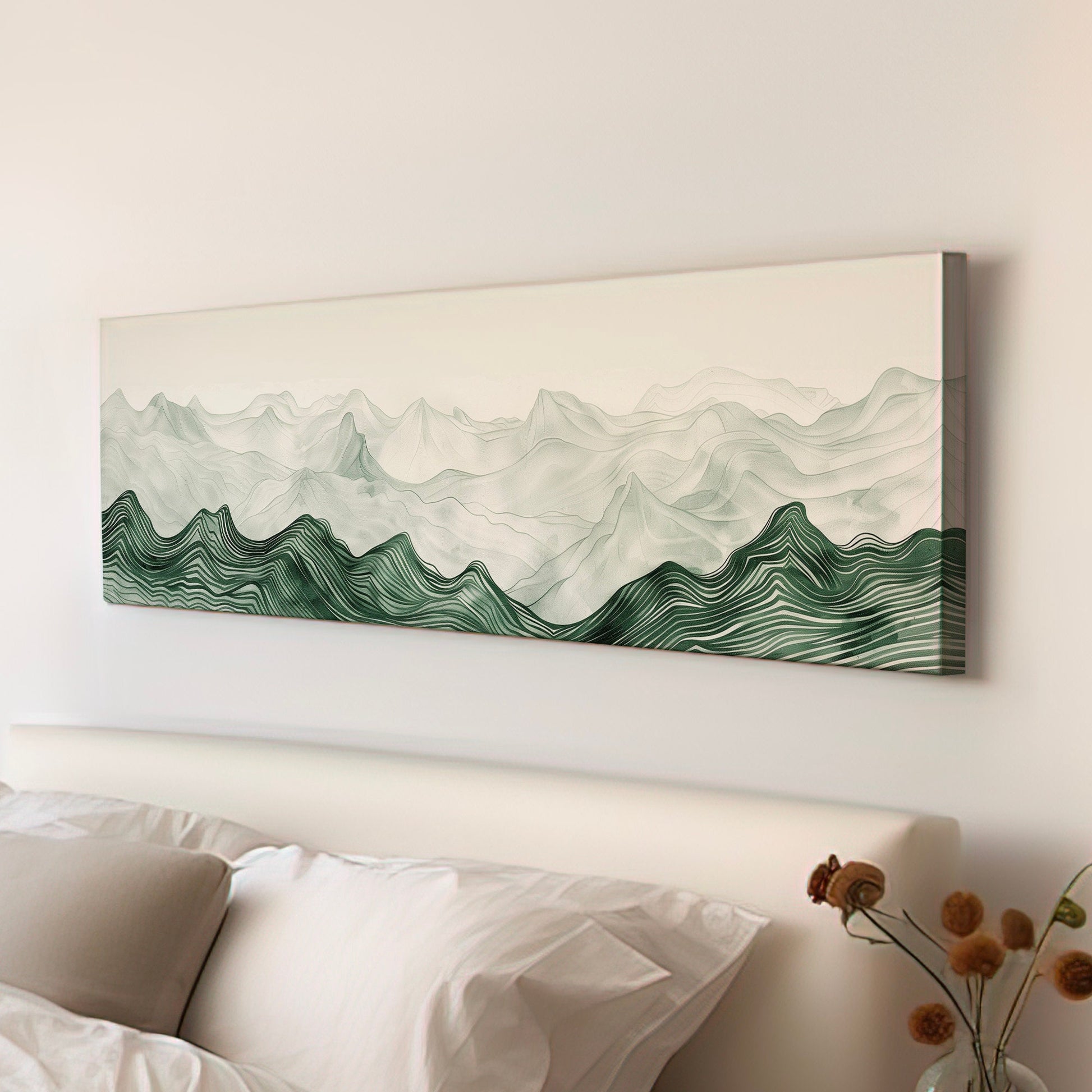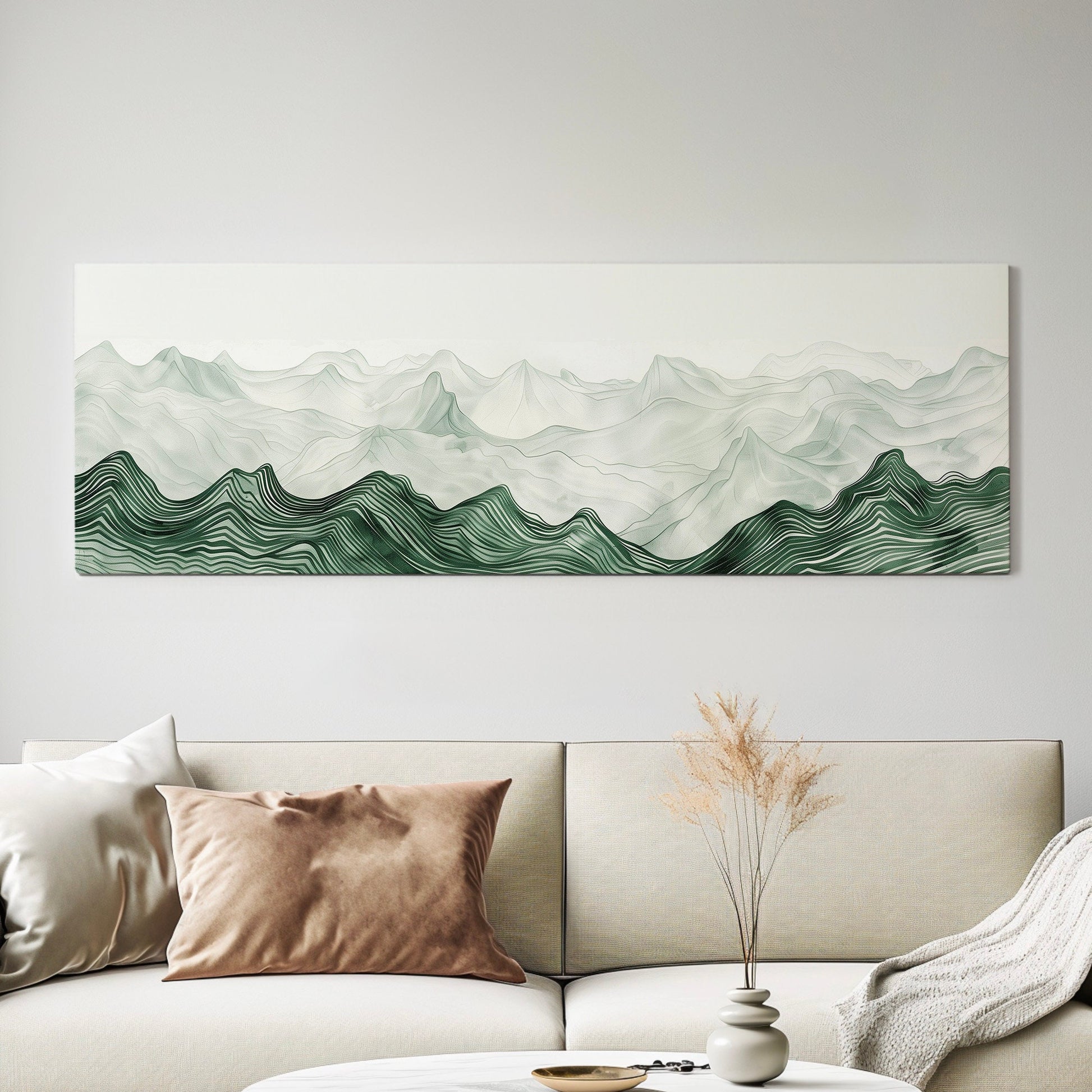 Landscape Sage Green Drawing Long Horizontal Wall Art Above bed, Panoramic Abstract Canvas Print, Minimalist Decor Canvas Art
