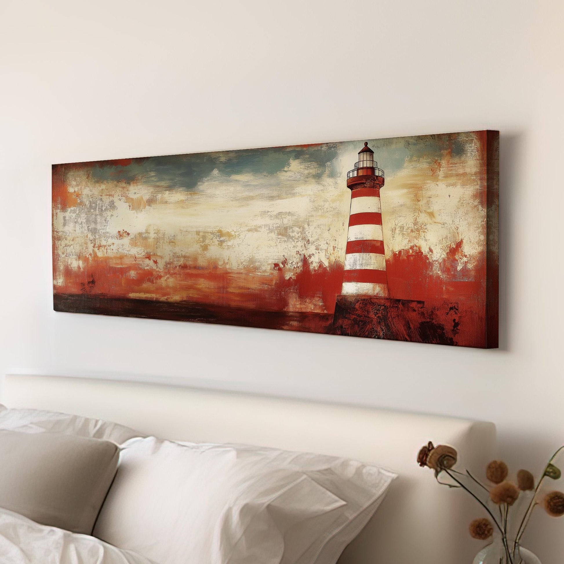 Red Lighthouse Panoramic Wall Art Lakehouse, Panorama Boathouse Canvas Print, Sea Coast Decor Canvas Art