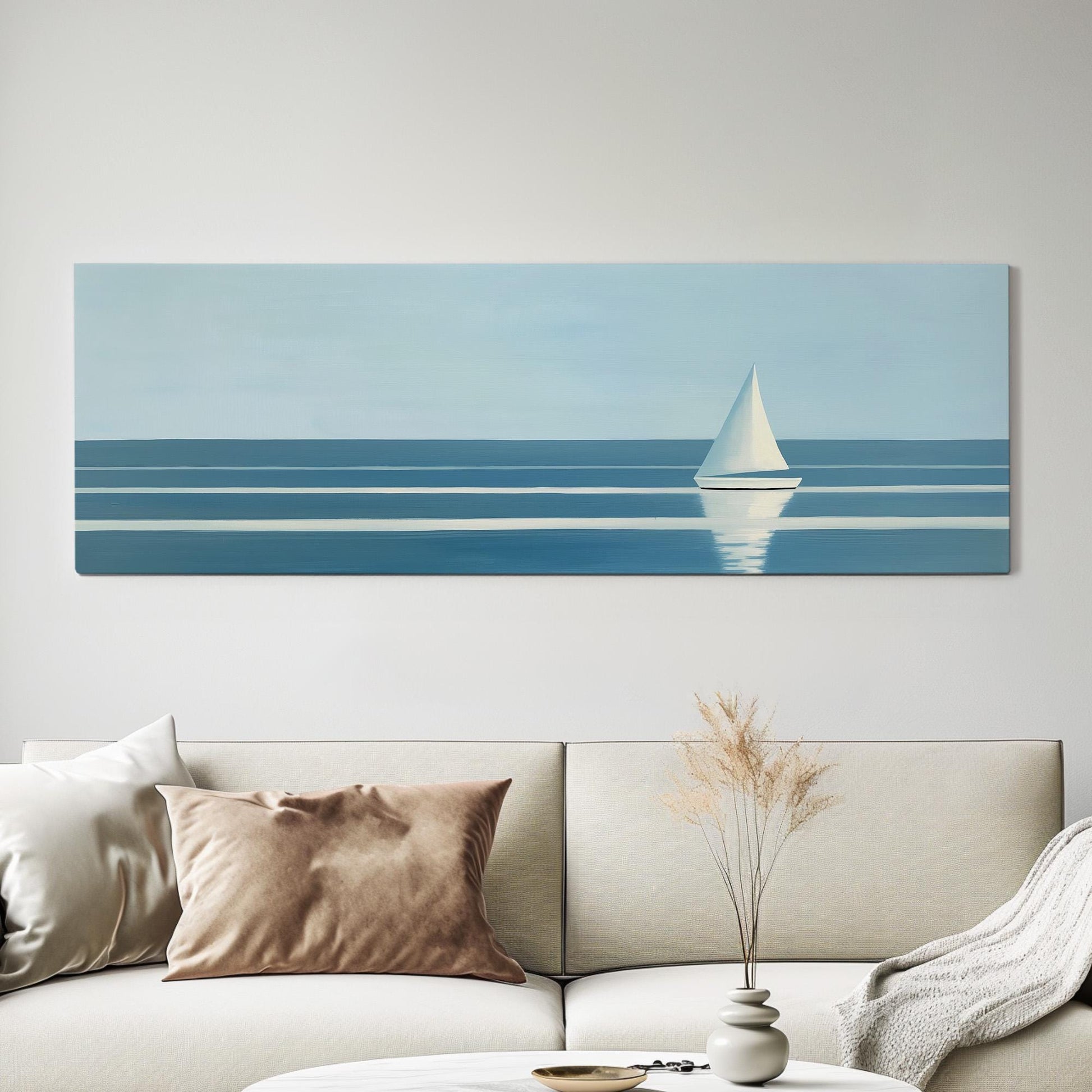 Sailboat Line Art Panoramic Wall Art For Bedroom, Panorama Lake House Canvas Print, Seascape Decor Canvas Art