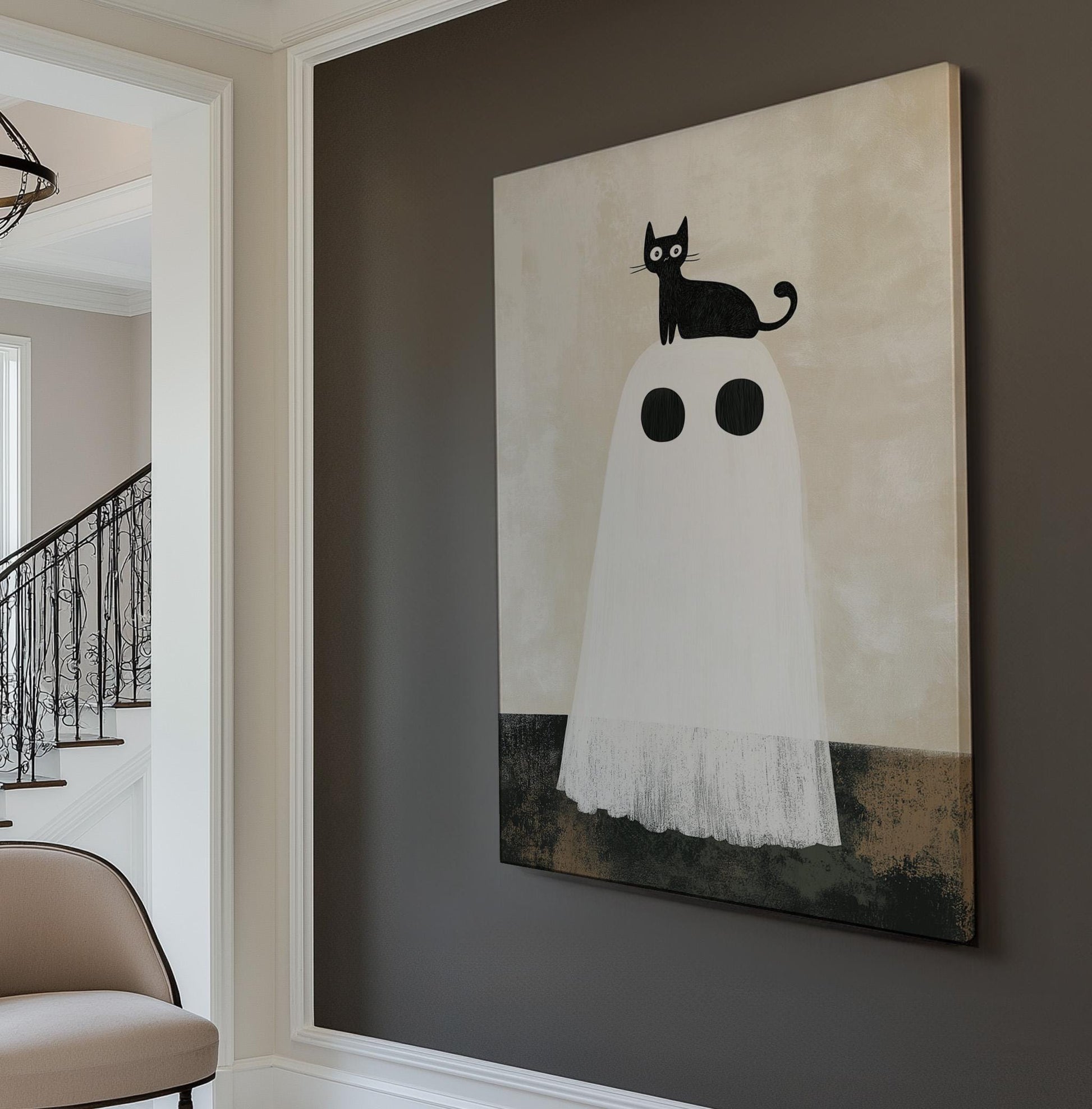 Spooky Halloween Ghost With A Black Cat Vertical Wall Art Spooky, Decor Dark Academia Canvas Print, Whimsical Big Canvas Art