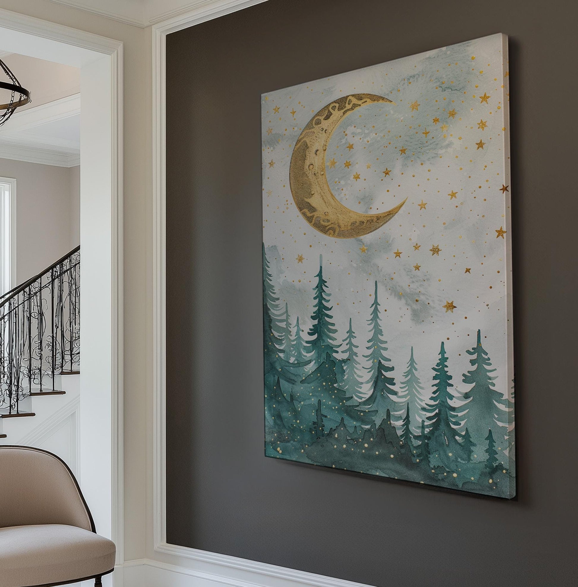Starry Night Above Pine Trees Vertical Wall Art Enchanted Forest, Decor Fantasy Forest Canvas Print, Farmhouse Cabin Big Canvas Art