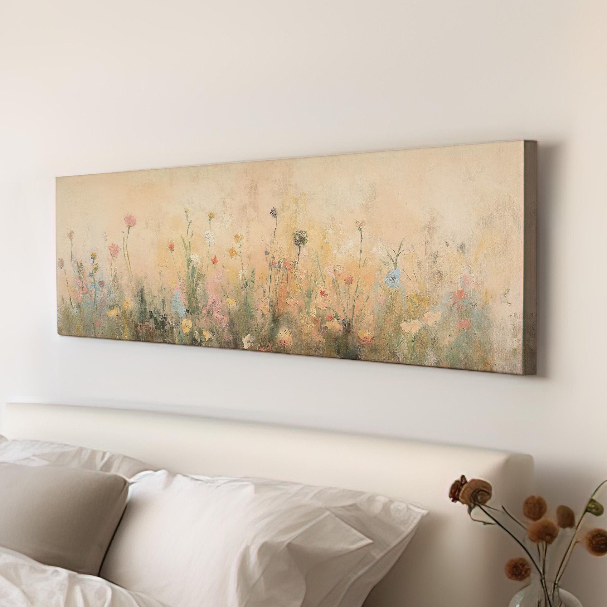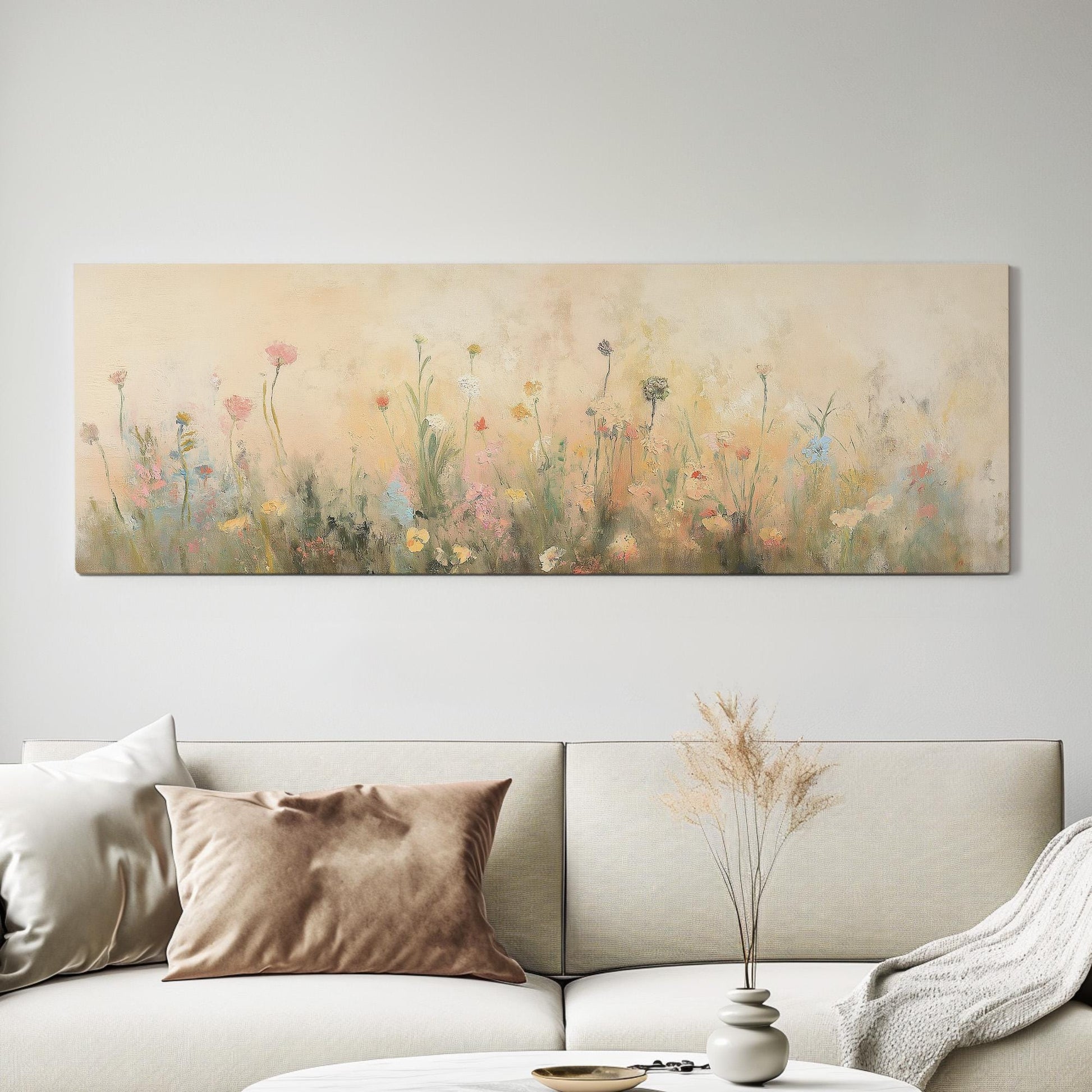 Textile Spring Meadow Panoramic Wildflower Field, Minimal Muted Landscape Canvas Print, English Countryside Printed Canvas Art
