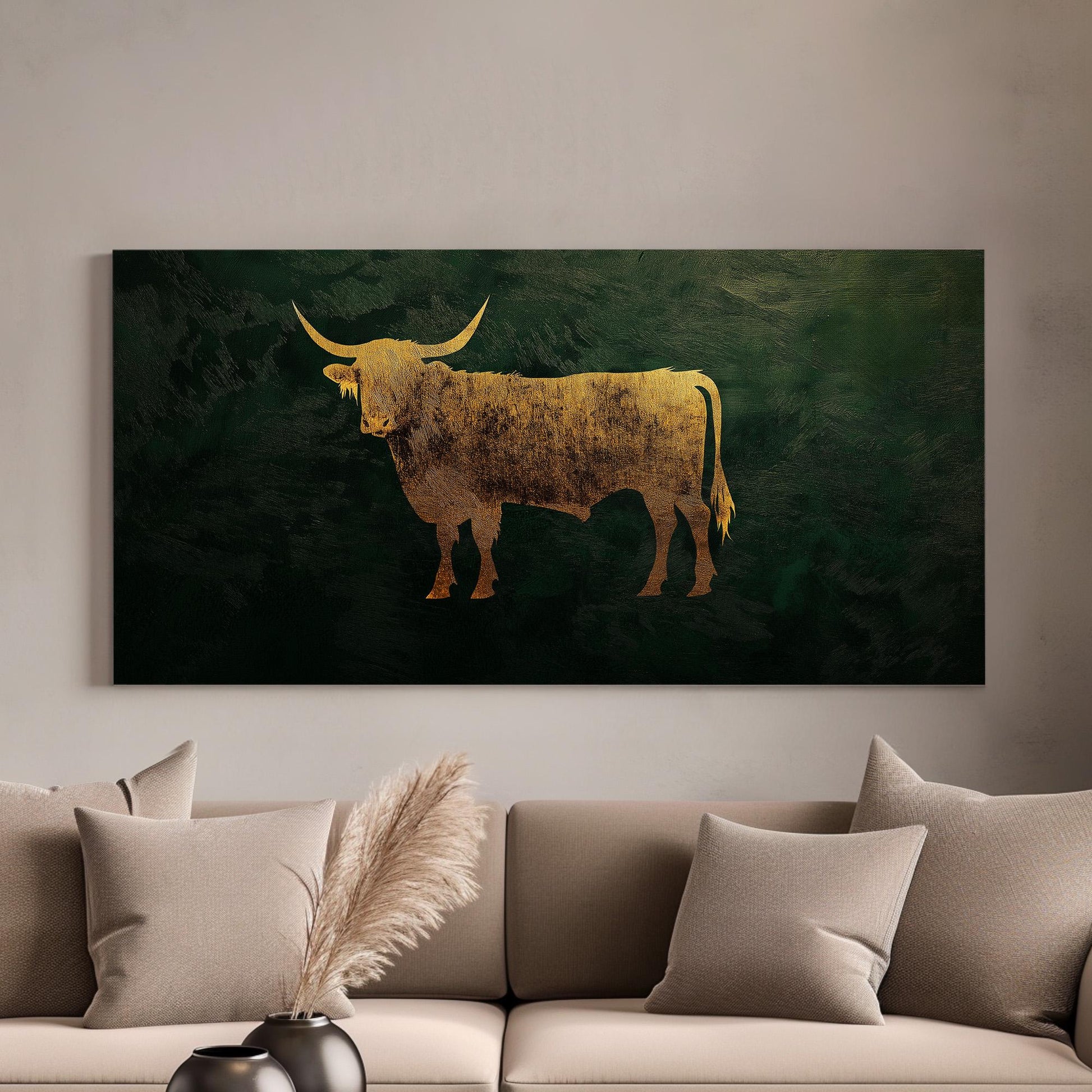 Vintage Gold Highland Cow Canvas Wall Art For Living Room, Landscape Dark Green Canvas Print, Rustic Large Canvas Art