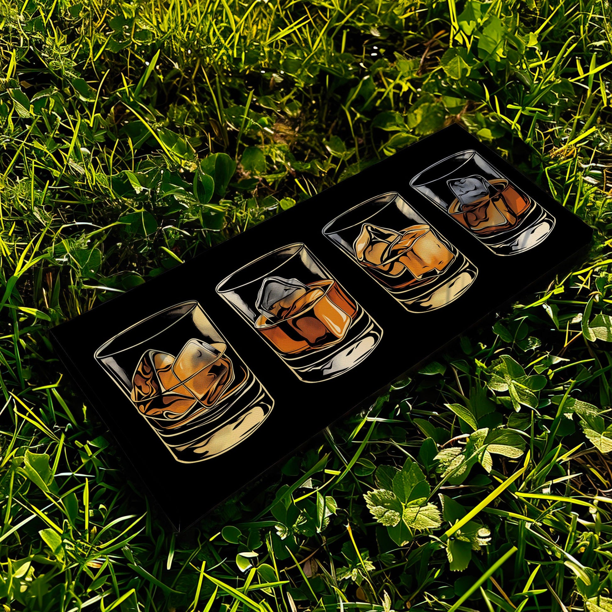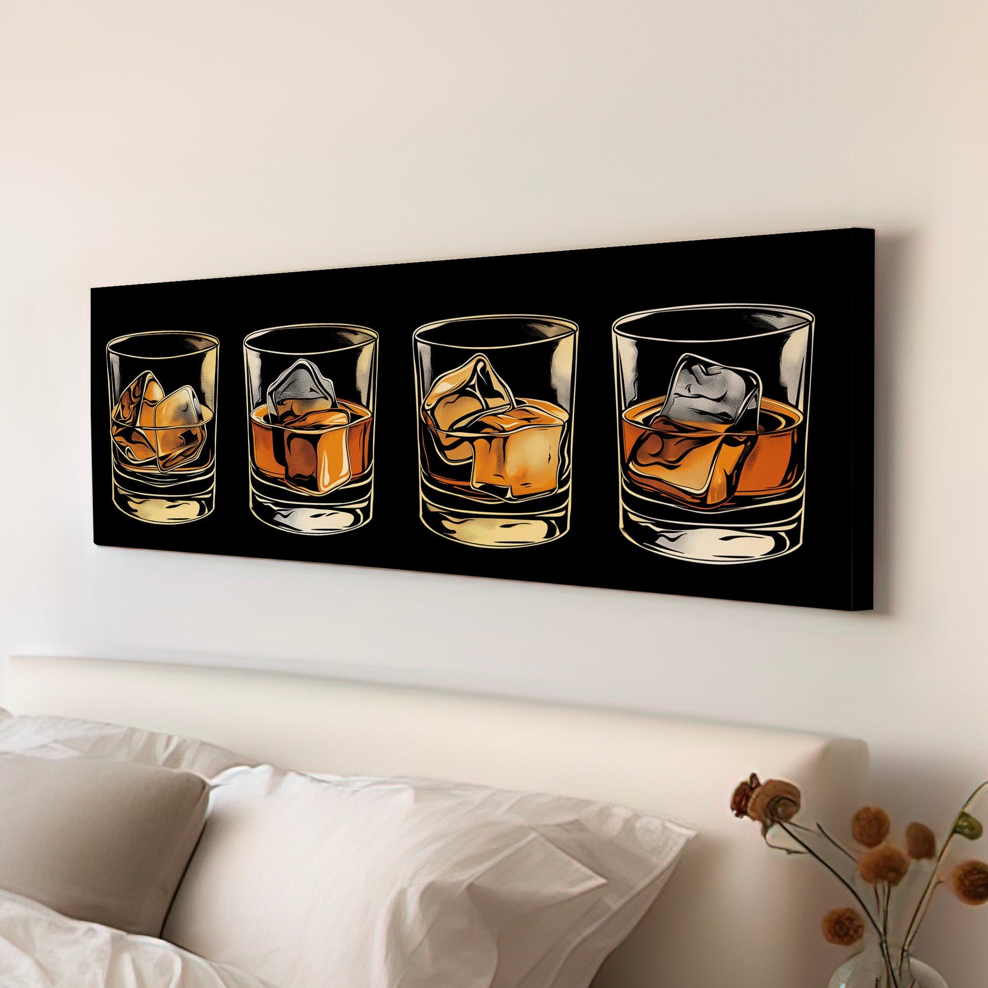 Whiskey Glass Above Bed Wall Art Bourbon Bar, Panoramic Scotch Canvas Print, Man Cave Long Horizontal Canvas Art